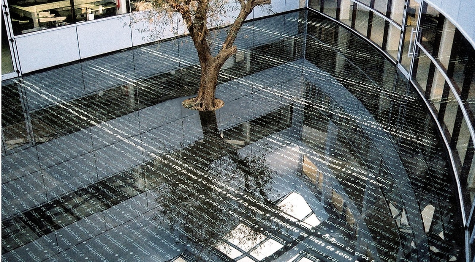 Floor intervention (18mx13,50m) in the patio of the "Ecole Hôtelière" (catering school ) of Aiguerande in Belleville near Lyon. An at random succession of culinary expressions, names of dishes and famous wines (to bone, coq au vin, Chateau Margaux...) are engraved in the glass floor which are scanned by a low computer driven light beam which enlightens successively different portions and allows the reading of the words. The artist has placed at the center a two century old olive tree imported from Spain.